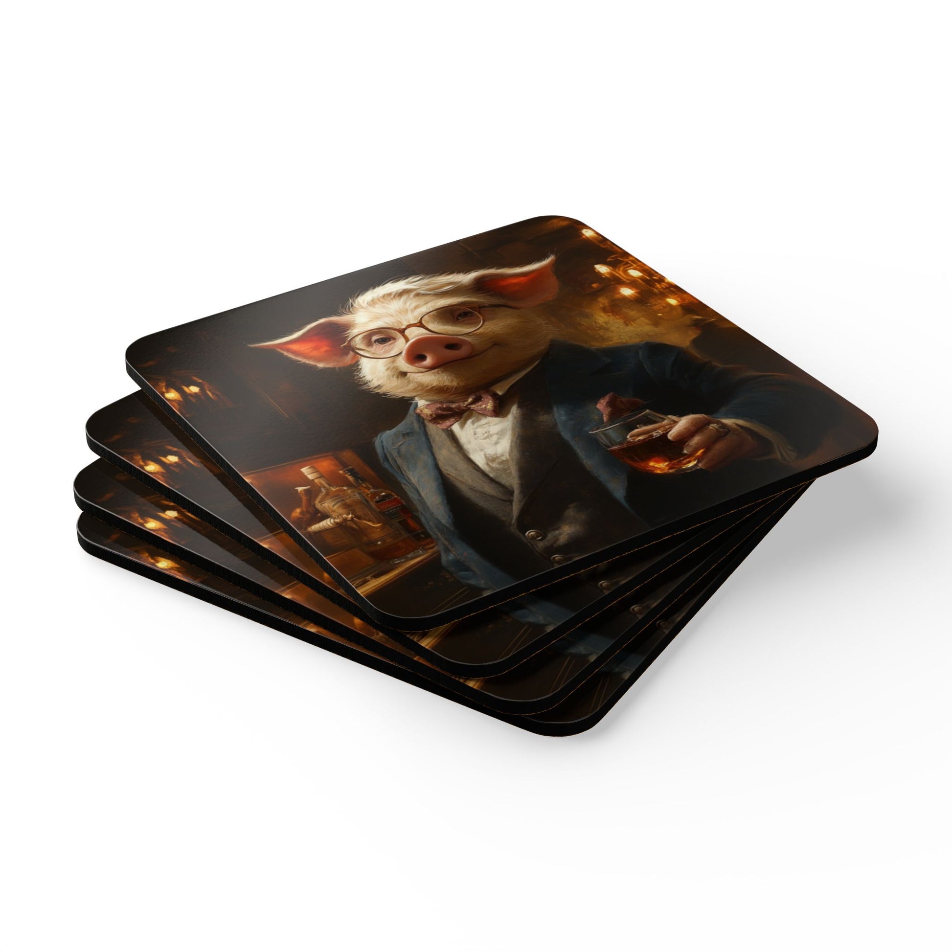 Perfect gift for the bourbon lover in your life. Who doesn't appreciate a gentlemen pig. Set of 4, made with a high-gloss top and feature a cork back to prevent sliding.