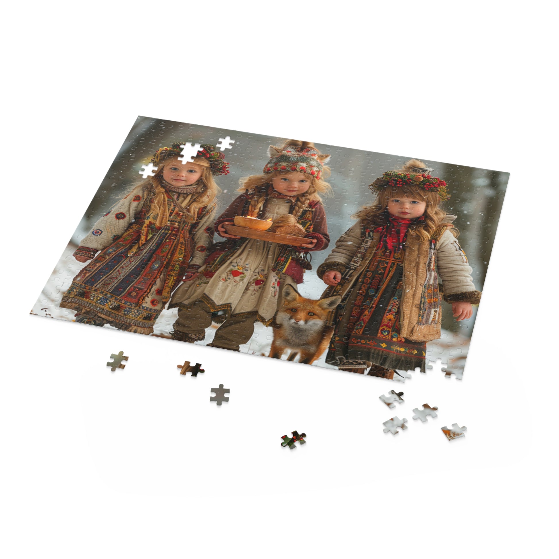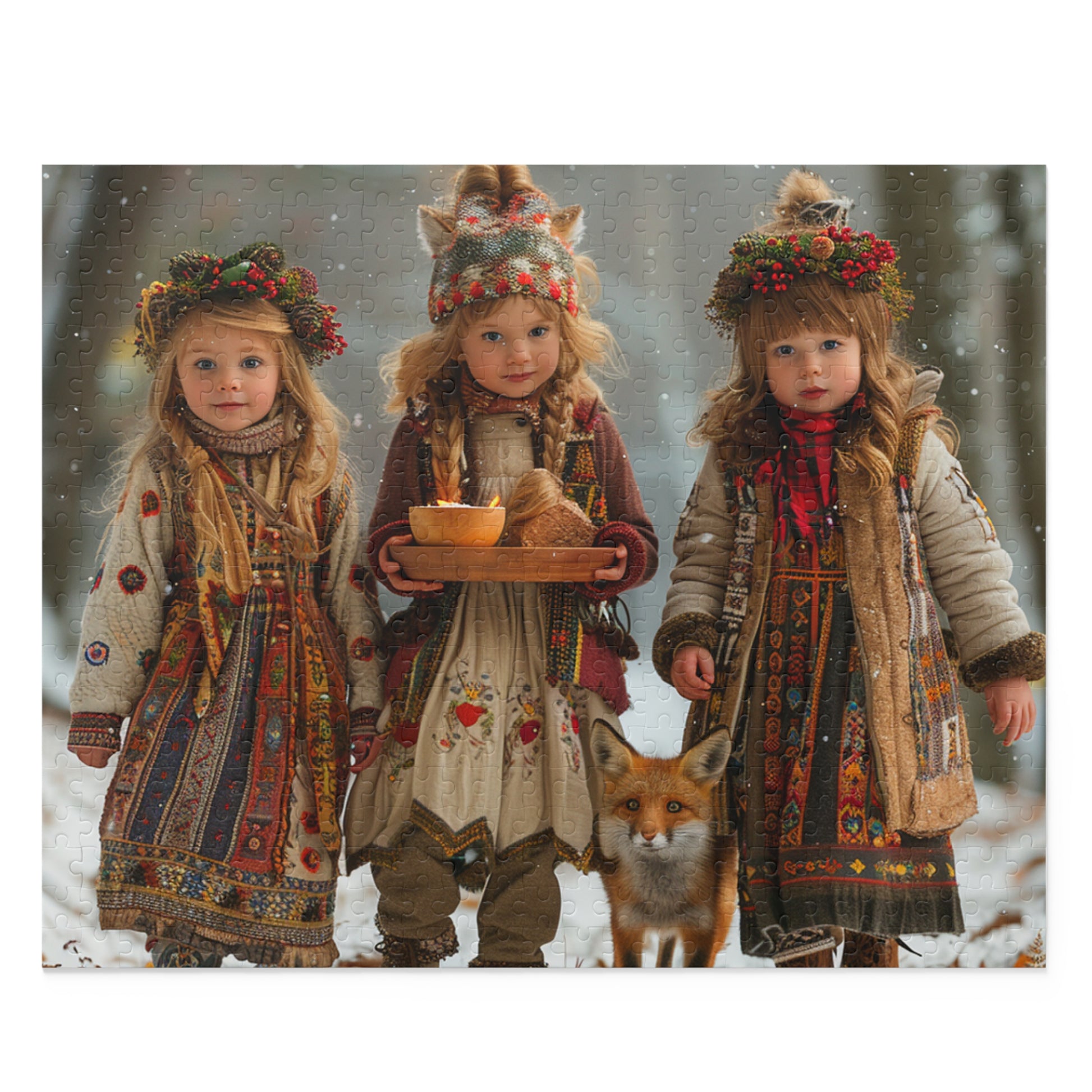 A charming puzzle featuring Scandinavian children walking through the snowy woods with a fox. Perfect for cozy winter evenings and family bonding time. Ideal for puzzle enthusiasts and nature lovers. Relevant for Christmas, winter holidays, and family game nights.
