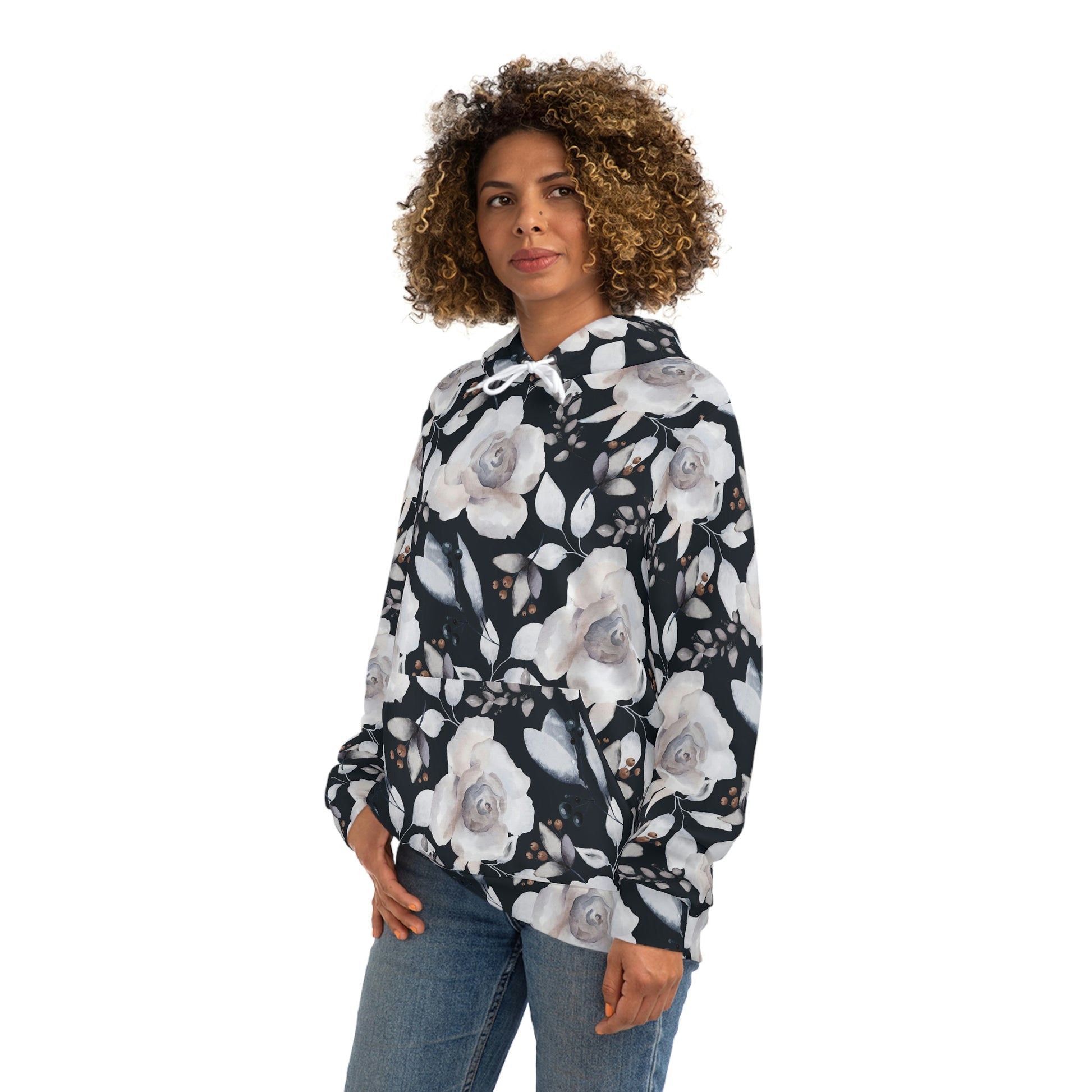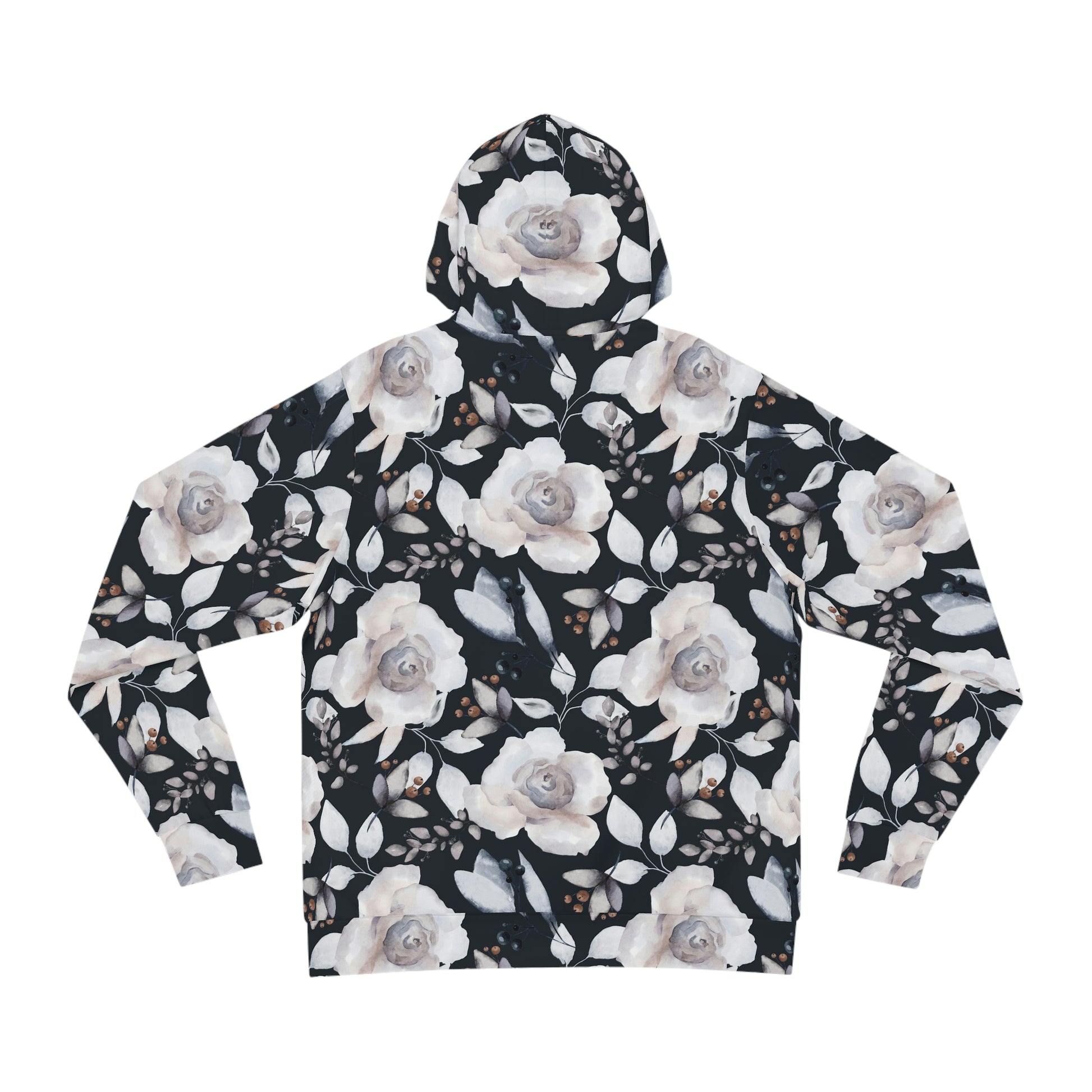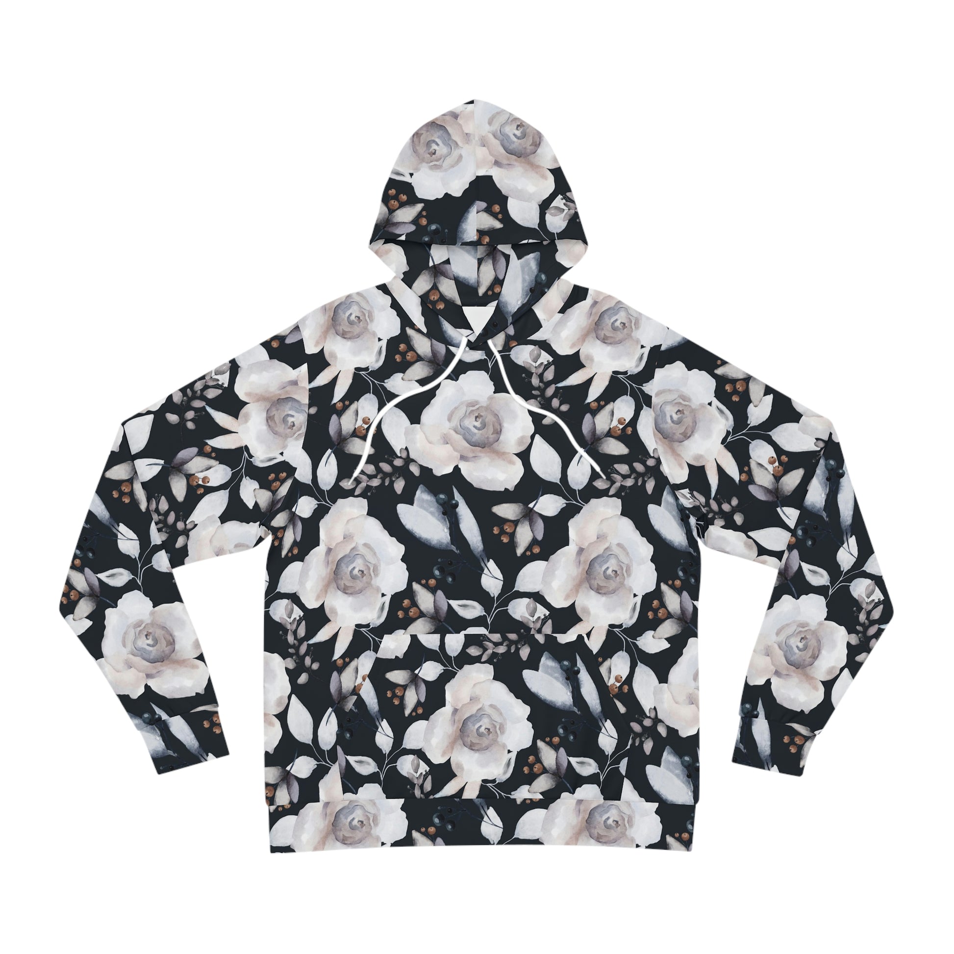 Watercolor roses and berries on a cozy hoodie. Be a couch potato or pull on black leggings and go to town. You will love this cozy, one of a kind hoodie